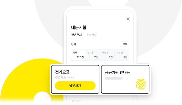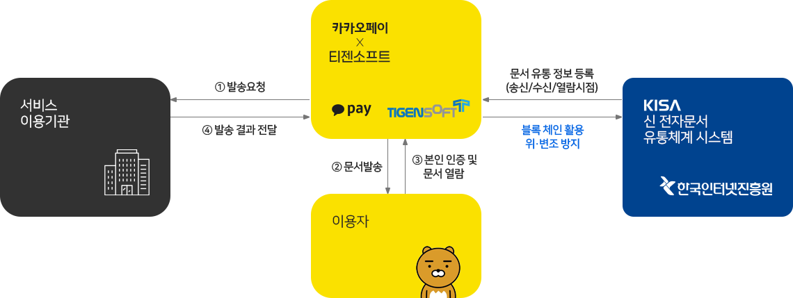 본인이 수령해야하는 각종 안내문, 등기우편 등 중요 문서를 카카오톡으로 전송하고 카카오페이 비밀번호 및 생체인증으로 본인 인증을 통해 전자문서를 확인 할 수 있는 정확하고 안전한 메시지 전송 서비스입니다. 티젠소프트는 카카오페이(전자문서)의 공식 파트너사입니다.